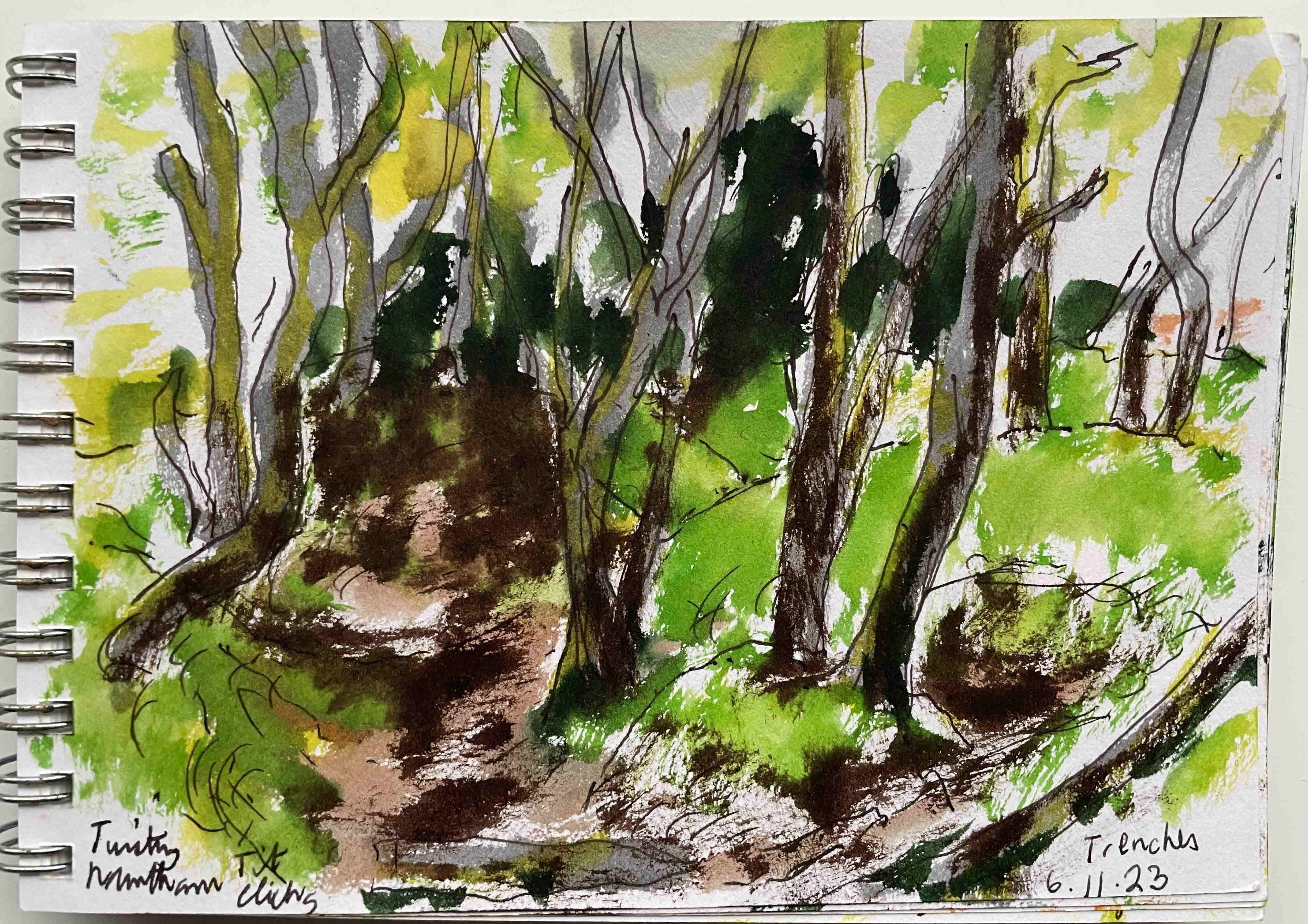 I come to the cleared area and sit on the top of a trench bank to draw them. The trenches are a pleasing mini landscape of winding valleys and bluffs, the banks topped with curving hawthorn trunks, making a thorny vault. It is superficially pastoral, but in this place there is a sourness, a disturbance and a feeling that things are not as they should be. Today it is nearing Remembrance Day – poppies are on sale in town. Wreaths will be laid at the war memorial by the golf course. The shadow of remembrance slides through this place, even as it looks pretty today in flickering late autumn sunlight, shining off golden leaves. When I come here I feel an intruder. It’s like visiting a churchyard. It is someone else’s sacred space. I don’t feel comfortable with the remembrance. Should I be drawing, using it for my aesthetic pleasure?