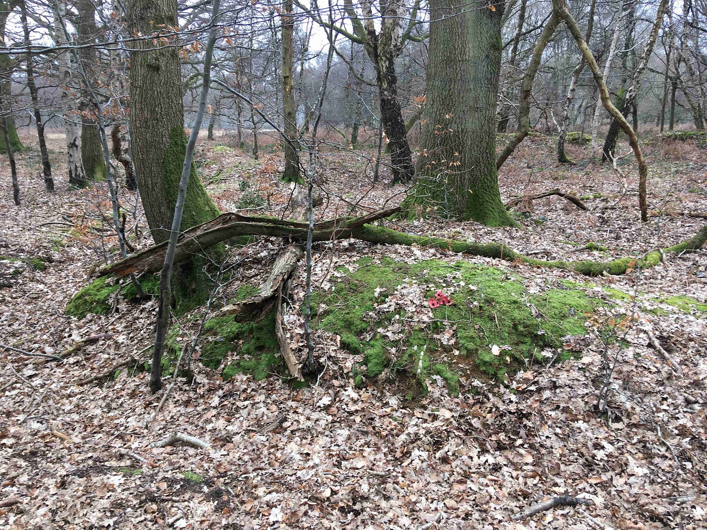 The trench has a path at the bottom, and I walk along it. A large oak tree is growing out of the bank. It cannot be more than a century or so old, yet it is a very substantial tree. The oak tree, an old symbol of British military might, the material of the great Empire navy: ‘Hearts of Oak’. The oaks grow like weeds on the Common. There are two parallel trenches along the hillside, joined by two downslope trenches of greater wiggliness and complexity, with hollows I think were called foxholes. I detour into one of them. Then I continue along the first trench. A deer path crosses it. Once I found a deer skull near here in a trench. There are large flints rolled down to the bottom. I wonder at the men digging this ground. They complained about it. The red clay is like concrete when dry and glue when wet. It is shot through with flint stones, glass hard. The trenches were once lined with posts, planks and sandbags, now long gone, leaving mini steep sided valleys. Material has fallen in so the trenches are now only waist deep, or less. The trench gets harder to pass along as bracken encroaches over the top, tough stems tugging at my legs. The trench ends at a large chalk pit. I have been told it was used as part of the system. I edge round the top of the quarry, and pass the end of the top trench, before I follow another deer path downhill, scuffed up with hooves into a muddy line through the leaf litter, down into the woods.’