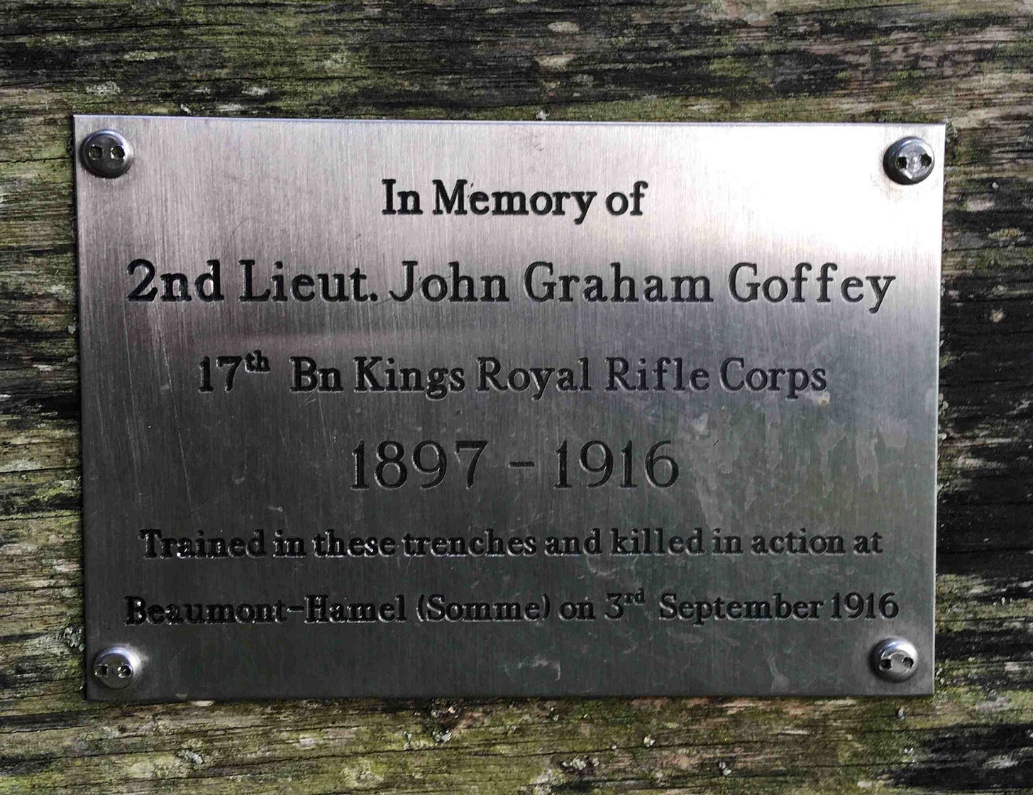 Just one of the men who fell is commemorated by name on the Common, on a plaque on the bench near the trenches. He lived in Berkhamsted, and his relations are still in the area.